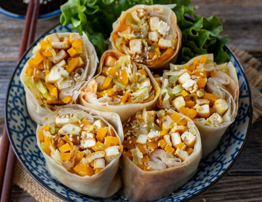 Une recette végétarienne de Run Bing, de savoureux rouleaux de printemps taïwanais aux légumes sautés et tofu grillé.