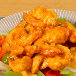 Ajoutez les crevettes frites à la sauce, mélangez rapidement pour bien les enrober. Versez un filet d’huile de sésame, disposez les légumes en base sur une assiette et servez les crevettes par-dessus.