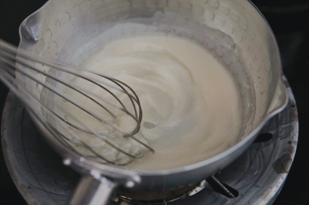 Si le Tangzhong peut paraître compliqué en théorie, il est en réalité très simple à réaliser. Pour préparer 50g de Tangzhong, mélangez 10g de farine à 50g d’eau ou de lait dans une petite casserole. Faites chauffer le mélange à feu doux en remuant constamment avec un fouet.