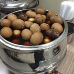 Bats les œufs dans un bol. Ajoute 160 ml d’eau chaude (non bouillante) et mélange. Passe le mélange au tamis fin pour éliminer les bulles et obtenir une texture lisse. Verse doucement sur le tofu.