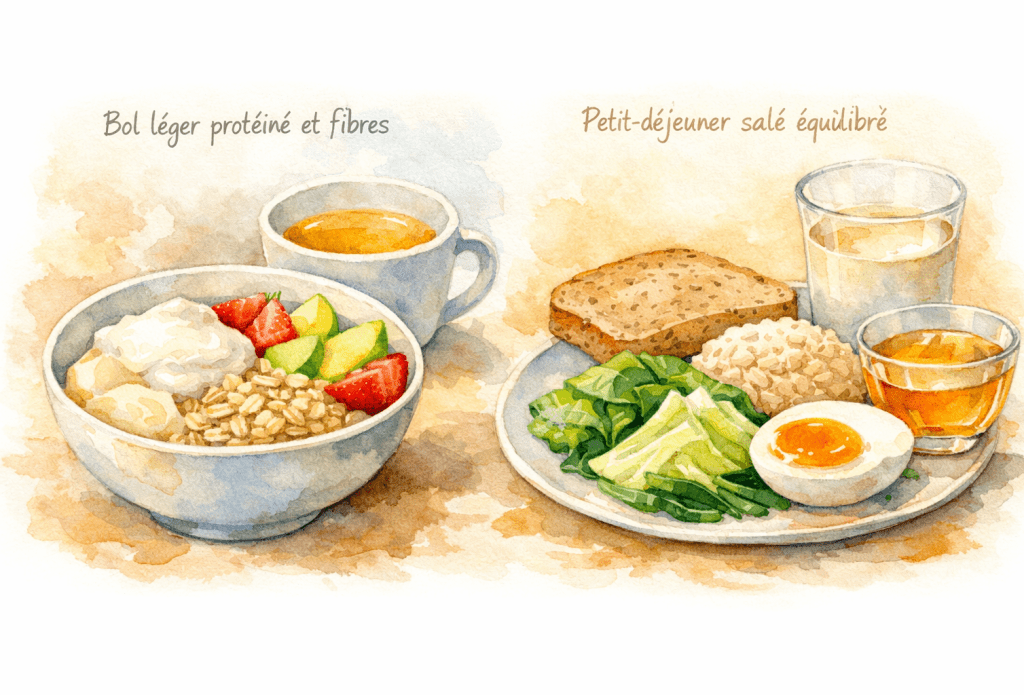 Cette structure permet de soutenir l’énergie matinale tout en favorisant la récupération digestive. L’objectif reste la régularité plutôt que la restriction. En période de repas abondants, le corps bénéficie davantage d’un ajustement progressif que d’un changement brutal.