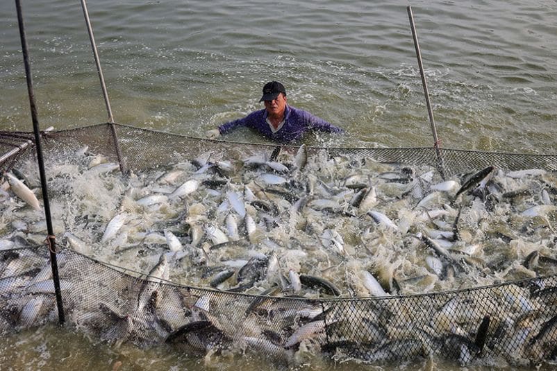 Pour la récolte, les travailleurs installent d’abord leur équipement sur le site, érigent des tentes pour l’ombre et mettent en place des bassins temporaires en toile. Deux travailleurs naviguent le long de l’étang sur un radeau et déploient un filet dans l’eau, tandis que d’autres, depuis la rive, commencent à tirer ce filet, dirigeant les poissons vers un autre filet rectangulaire préalablement installé. Tôt le matin, vers 6 ou 7 heures, les ouvriers agitent l’eau pour effrayer les poissons, les incitant à vider leurs intestins. Un poisson à l’intestin vide se conserve mieux.