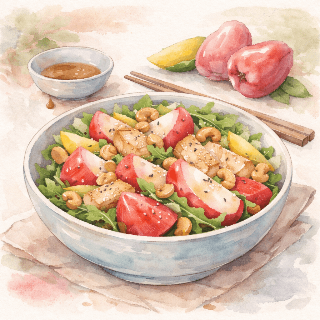 Couper les Pommes de Java en quartiers fins et retirer le cœur spongieux. Mélanger la roquette, la mangue, le poulet ou le tofu, puis ajouter les quartiers de fruit. Arroser de vinaigrette et saupoudrer de noix de cajou et de sésame. L’association met en valeur la fraîcheur croquante du fruit, équilibrée par la douceur et la note salée.