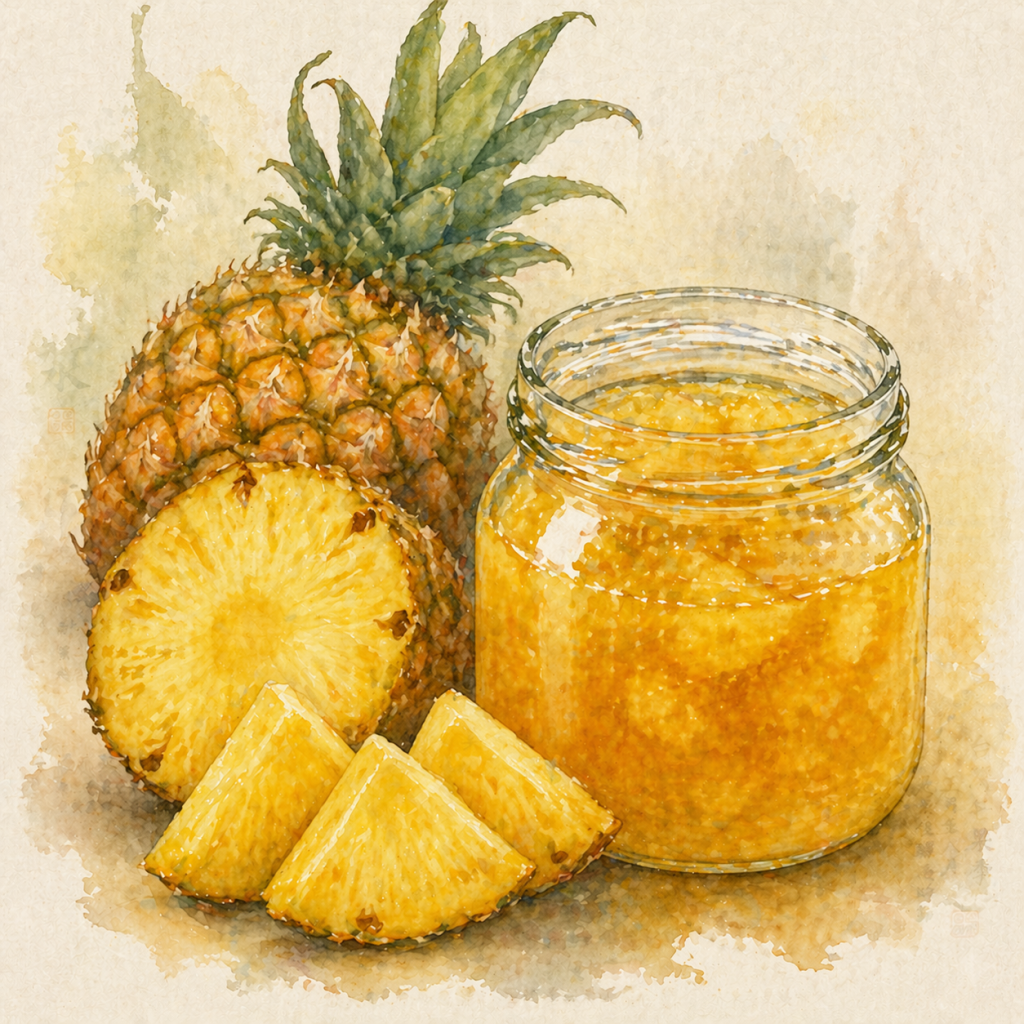 L’ananas est l’un des fruits les mieux adaptés à la méthode Koso. Sa haute teneur en broméline — une enzyme naturellement présente dans sa chair — accélère le processus de fermentation et produit un sirop particulièrement vif, acidulé et légèrement piquant. À Taïwan, l’ananas est cultivé notamment dans le comté de Nantou (南投縣) et à Tainan (台南), et reste disponible toute l’année à prix très accessible. La variété locale Tainong 17 (台農17號, dite ananas au miel) est idéale pour ce sirop : sa chair sucrée et peu fibreuse libère beaucoup de jus rapidement. En moins d’une semaine, les bulles sont déjà visibles. Dilué dans de l’eau avec quelques feuilles de basilic thaï (九層塔), ce sirop devient un cordial maison remarquable.