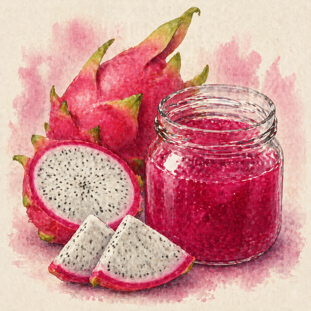 Le fruit du dragon produit l’un des sirops Koso les plus spectaculaires visuellement. La variété à chair rouge-violette (紅肉火龍果) libère une couleur pourpre profonde dès les premières heures — un sirop naturellement coloré, sans aucun additif. Le fruit du dragon est cultivé intensivement à Taïwan, notamment dans les comtés de Pingtung (屏東縣) et de Chiayi (嘉義縣), où les champs illuminés de nuit par des ampoules sont devenus un paysage caractéristique de l’île. Sa chair douce et peu acide donne un sirop subtil et légèrement floral, qui gagne à être associé à de la fleur de citron vert ou à une pincée de sel fin pour relever les saveurs. Mélangé à du lait de riz ou du lait d’amande, il devient une boisson du soir particulièrement belle.