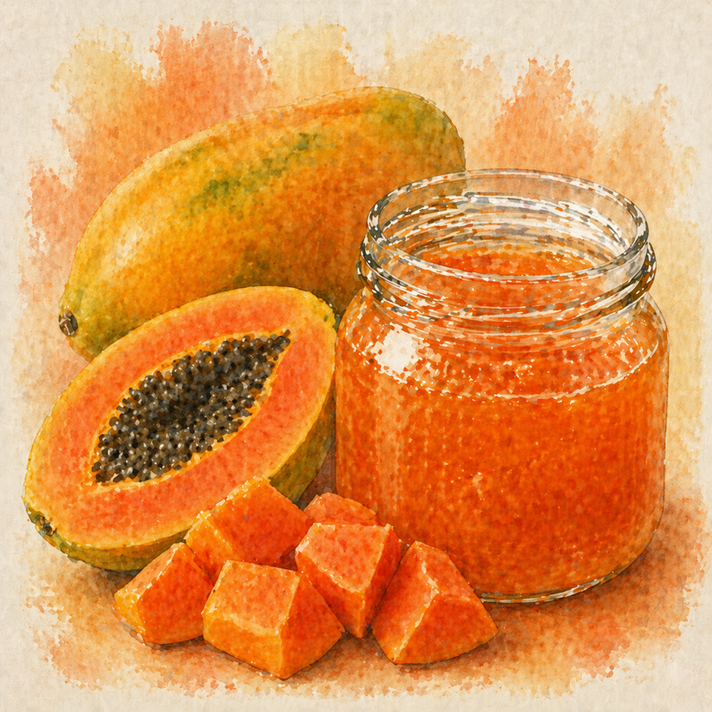 La papaye est peut-être le fruit le plus intéressant de cette sélection sur le plan enzymatique. Elle contient de la papaïne, une enzyme protéolytique naturelle réputée pour ses effets sur la digestion. En Koso, cette enzyme survit en partie au processus de fermentation, renforçant les vertus déjà présentes dans la méthode japonaise. À Taïwan, la papaye pousse pratiquement à toutes les altitudes et à toutes les saisons — les marchés de nuit en débordent souvent. Pour ce sirop, choisissez une papaye très mûre, dont la peau vire à l’orange-rouge : la chair sera plus sucrée, plus fondante, et produira un sirop ambré au goût de fruit exotique caramélisé. Une pointe de vanille ou de cardamome transforme ce sirop basique en quelque chose de vraiment remarquable, idéal pour parfumer un riz au lait ou une panna cotta.