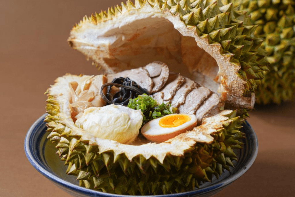 - Ramen Royal au Durian : Ramen servi dans une coque de durian, avec bouillon miso crémeux au durian, porc chashu, œuf mariné, champignons noirs et oignons verts.
