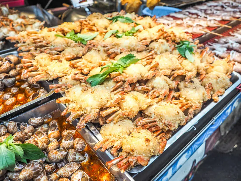 L’une des meilleures adresses est 吳記螃蟹羹油飯 ( Wú jì pángxiè gēng yóu fàn, ou soupe de crabe de Wu et riz à l’huile glutineuse ; adresse numéro 5). Visiteurs qui n’aiment pas les fruits de mer vous trouverez aussi votre bonheur. Les petites saucisses de l’échoppe 43-1, 一口吃香腸 ( Yīkǒu chī xiāngcháng) sont exceptionnelles, et les tempura de l’échoppe 16 王記天婦羅 (Wángjìtiān fù luó, Wang Ji Tempura) n’ont pas leur pareil.