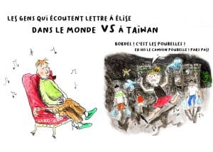 Suzanne croque avec humour l’arrivée des camions poubelles à Taïwan sur la « Lettre à Elise » de Beethoven pour signaler leur arrivée !