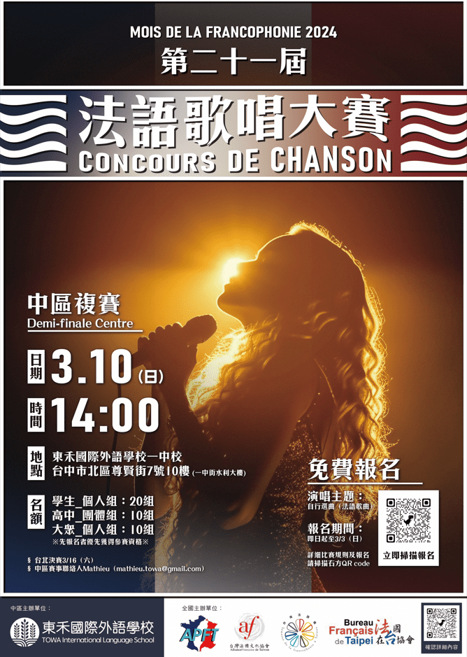 La grande finale de cette édition 2024 concours de chansons francophones aura lieu cette année, le samedi 16 mars 2024 à Taipei, à l’Université Shida. (Adresse : 台北市大安區和平東路一段129號之1博愛樓5樓504室)