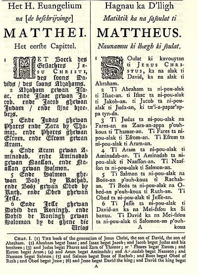 Évangile de saint Matthieu en néerlandais, en sinkang, en taivoan et en anglais. L’original néerlandais et Sinkang ci-dessus date de 1661 et a été écrit par Daniel Gravius ; l’anglais en petits caractères a été ajouté en 1888 par le missionnaire écossais William Campbell.