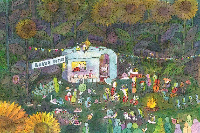 Ma cuisine du dessin c’est beaucoup de détails, de motifs ou de traits, des couleurs vives, de l’humour et des personnages rigolos, de musique, odeurs, bruits et mélodies et une pointe de mélancolie.