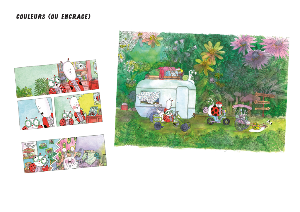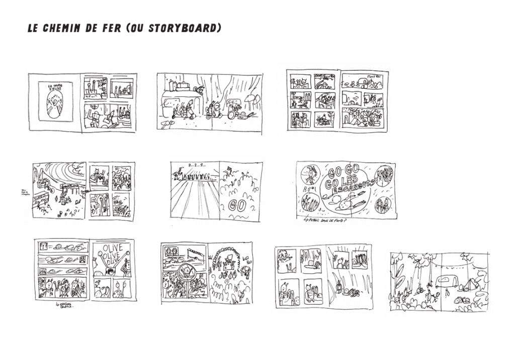 Ensuite je fais un storyboard ou chemin de fer, c’est un découpage, en tout petit qui va m’indiquer où je place les actions, où ira le texte, ce qui se passe au moment de tourner la page. C’est une étape où il faut se poser la question du rythme, des émotions. C’est assez réflectif, il y a plein de possibilités qui vont parfois changer radicalement le ton de l’histoire, et je pense que c’est une de mes étapes préférées. C’est un peu l’essence de l’histoire. Souvent je retravaille le texte à ce moment-là.