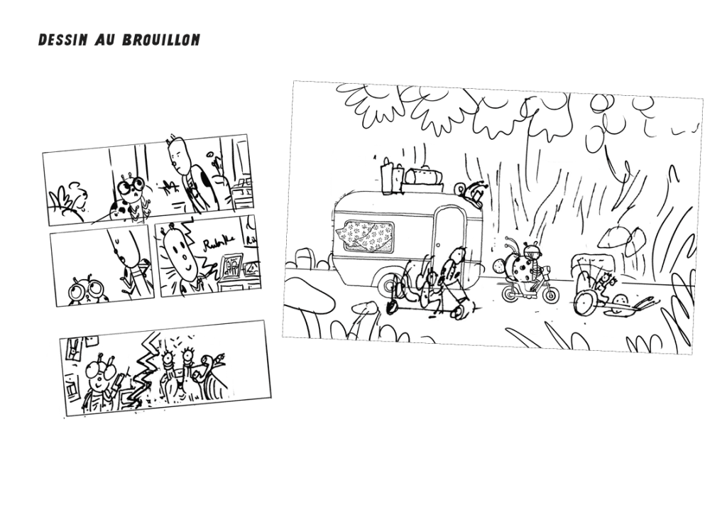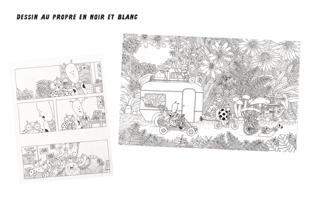 Ensuite je fais les dessins au brouillon, souvent sur l’ordi pour avoir plus de manœuvre de changements, faire plein de tests. Quand je suis satisfaite de la mise en page, je fais mon dessin en noir et blanc.