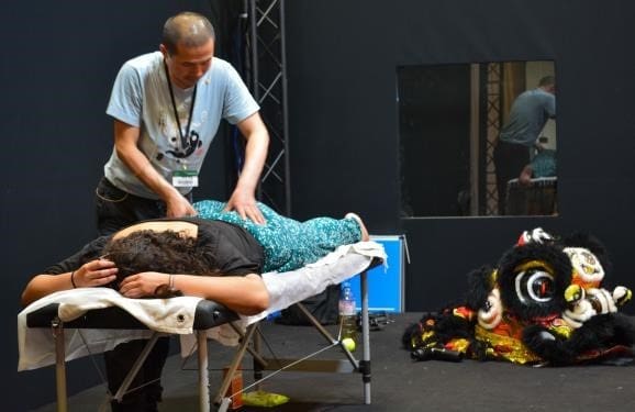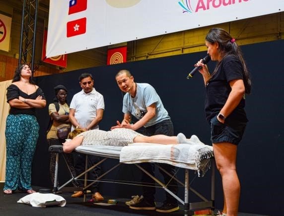 Mais après cette prestation dynamique vient le moment de la méditation et de la détente, avec une séance de massage présentée et réalisée par Charles Vong, praticien en médecine traditionnelle taïwanaise, qui nous explique son métier.