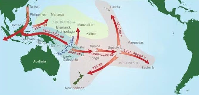 Durant le millénaire suivant, ces sociétés nouvellement établies ont colonisé les diverses îles de la Polynésie, y compris Hawaï vers l’an 900, l’île de Pâques autour de l’an 1000, et ont finalement atteint la Nouvelle-Zélande aux alentours de l’an 1200. Bien que distincts des Aborigènes d’Australie, des indices suggèrent que ces peuples pourraient avoir atteint l’Amérique du Sud par la suite, bien que ces preuves restent encore à confirmer.