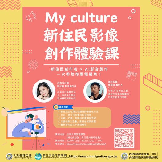 Le ministère de l’Intérieur, via l’Agence nationale de l’immigration, lance un nouvel atelier intitulé « My Culture 新住民影像創作體驗課 », destiné à encourager les nouveaux résidents et leurs enfants à développer leur capacité à raconter leur histoire culturelle à travers l’image. L’initiative combine narration, création audiovisuelle et outils d’intelligence artificielle afin d’accompagner les participants dans la production de contenus qui reflètent leur identité et leur expérience.