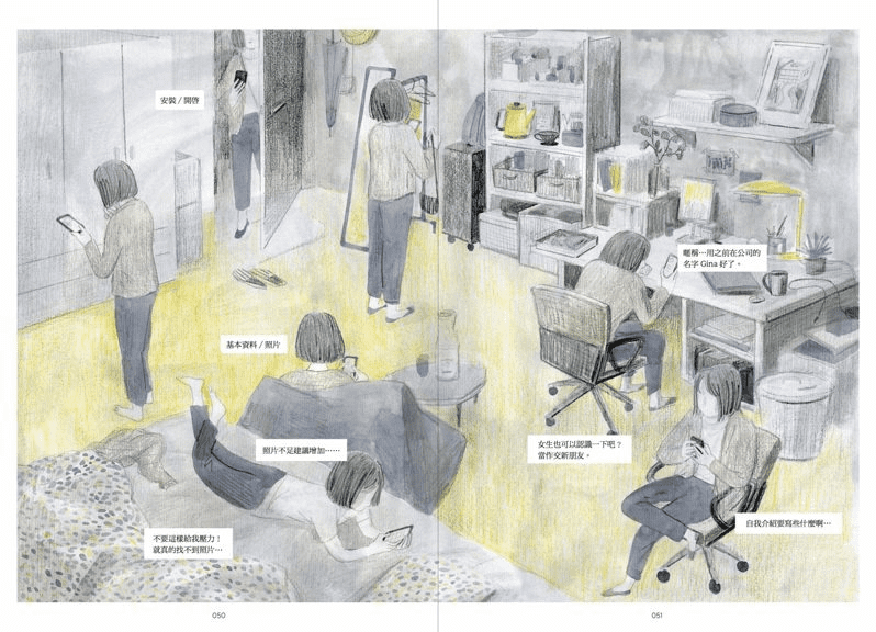 Adapté d’une nouvelle homosexuelle contemporaine “Harmonie centenaire, fleur de lys centenaire” 百年百合 par l’écrivaine Hikaru Lee 李屏瑤, cette nouvelle graphique de 30 planches décrit l’expérience d’une citadine qui trouve l’âme soeur sur une application de rencontres. Le récit suit l’évolution psychologique de l’héroïne qui s’attache à une relation amicale féminine en ligne via l’application, toute en vivant son entourage quotidien entre métro boulot et dodo, mais aussi sur son balcon, sur un banc dans un parc, au cinéma toute seule ou dans son petit studio. Toujours avec son style graphique très urbain, ses portraits de personnages simples mais dans des décors sophistiqués, l’autrice nous plonge à nouveau dans une ambiance de solitude urbaine, où la multitude de bâtiments, édifices et intérieurs décrits dans le décor servent à faire comprendre aux lectures les tourbillons psychologiques des personnages. (3)