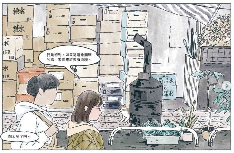 Tantôt une balade nocturne dans les rues de Taipei, tantôt une visite d’un appartement typiquement taiwanais, recommandant même un lieu de concert live de Taipei (Witch House 女巫店)le récit annonce pourtant une certaine maturité et sophistication dans son scénario, où les pensées des personnages vont se mêler au présent narratif. (4). La toute dernière nouvelle graphique “Outsiders 局外人“ de Chen Pei-Hsiu est publiée au mois d’avril dans un magazine artistique “Modern Art” 現代藝術 (numéro 211 d’avril 2024 par le Taipei Modern Art Museum), va décrire le quotidien d’un jeune couple urbain à Taiwan, et qui ne semble pas partager le même degré d’insouciance vis-à-vis des guerres contemporaines qui ont lieu à Gaza ou en Ukraine. (5).