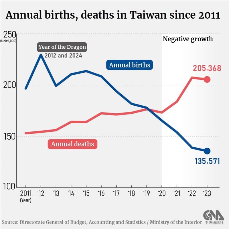 Dans le même temps, les décès à Taïwan ont dépassé les 200 000 pour la deuxième fois dans l’histoire enregistrée, atteignant 205 368. Cela représente une baisse de 1 862, ou 0,9 %, par rapport au record de 207 230 citoyens taïwanais décédés en 2022, et correspond à un taux de mortalité brut de 7,90, selon les statistiques.