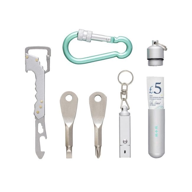 Destiné aux baroudeurs, ce kit rustique contient une lame, un outil pour poisson, un crochet extracteur, tournevis, ouvre-boîte, etc. Pour les vrais survivalistes.