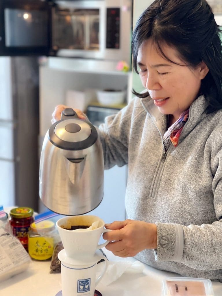 我住在陽明山一棟3層樓樓的房子,地震當時我剛好在沖咖啡,突然之間看到所有的東西都在震動,房子也在震動,一下子時間不曉得該怎麼辦,非常驚恐跑到1樓,但發現鄰居都沒有跑屋子,而留在室內。不一會兒他們才跑出來,並且大聲地說好可怕。