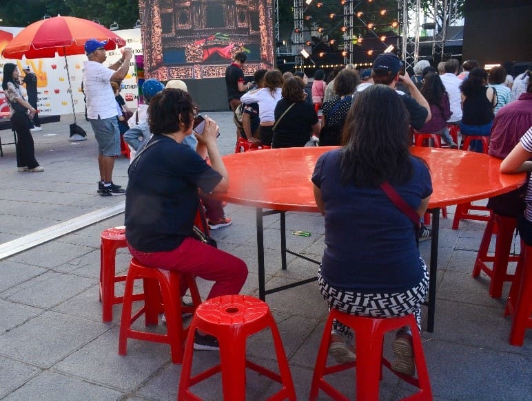 Une atmosphère voulu par le directeur artistique Kun Ying qui désirait reproduire l’environnement pour ses visiteurs, intrigué par ces nouveaux spectacles : “Nous apportons tout le symbolisme taïwanais ici, ce qui permet de voir les grandes lanternes, les images des temples, les tables et les chaises rouges. Il s’agit d’un aspect très connu à Taïwan, car nous nous rassemblons tous sur le marché nocturne devant les temples, et nous avions donc voulu amener ce concept ici.”, une belle façon de promouvoir de manière immersive la culture taiwanaise durant cet évènement.