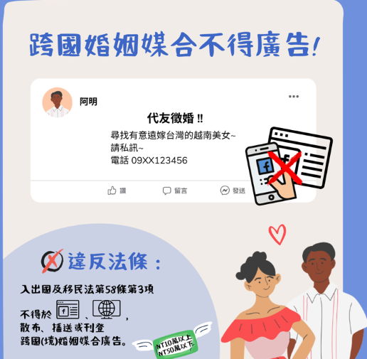 L'agence de l'Immigration de Taïwan sévit contre les publicités de mariage illégales sur Facebook avec des amendes record.