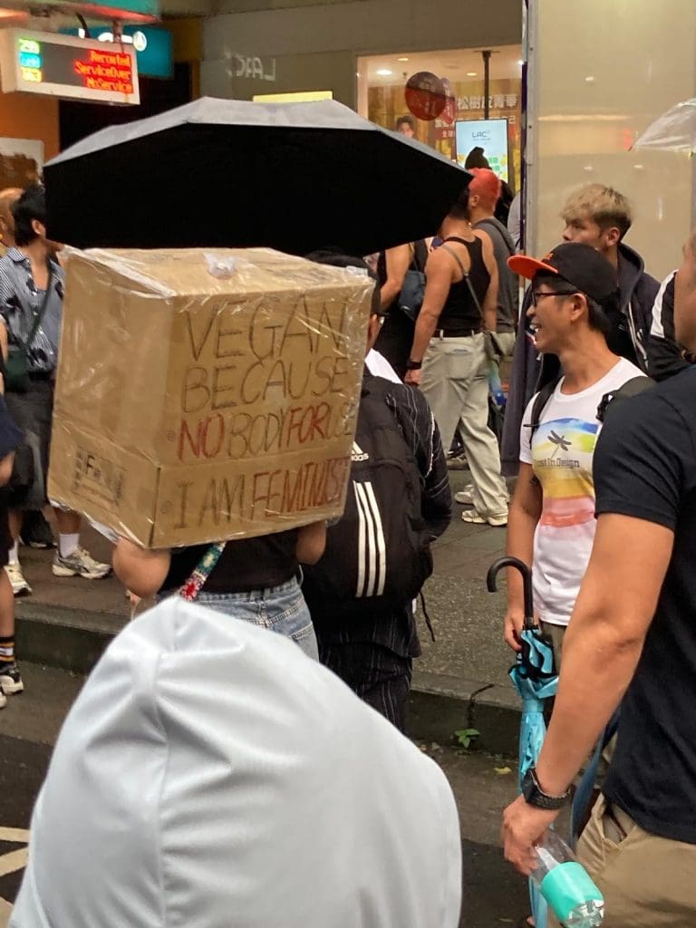 Pancarte « Vegan parce que je n’ai pas de corps à utiliser, je suis féministe ! » – Copyright : Margaux