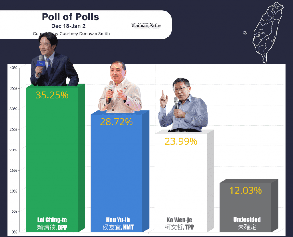Les sondages qui comptent le nombre réel de personnes (un vote exprimé, une personne contactée) par téléphone, par internet et mêmes les sondages dans la rue tendent à favoriser Ko, particulièrement sur les réseaux sociaux où il jouit d’une forte présence. En revanche, les sondages traditionnels (qui font une estimation des votants à partir d’un échantillon) avantagent Lai et Hou. Sur les 14 sondages analysés, bien que tous placent Lai en tête, la compétitivité de Hou reste évidente, certains sondages le montrant à peine trois points derrière Lai. Cependant, d’autres sondages donnent à Lai une avance de plus de 10 points.