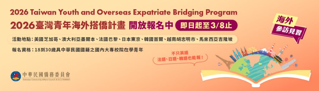 Étudiants taïwanais : candidatures ouvertes pour le programme Youth overseas 2026, multilingue et soutenu financièrement.
