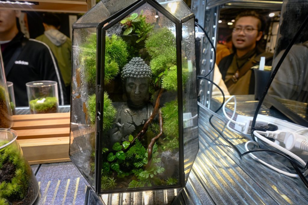 L’ambiance lumineuse est souvent tamisée, avec des éclairages horticoles design, créant une atmosphère de forêt tropicale futuriste sous le dôme de Yuanshan. D’autant plus que certains écosystèmes fermés sous verre offrent des micro-paysages impressionnants, comme celui d’un Bouddha entouré de mousse.