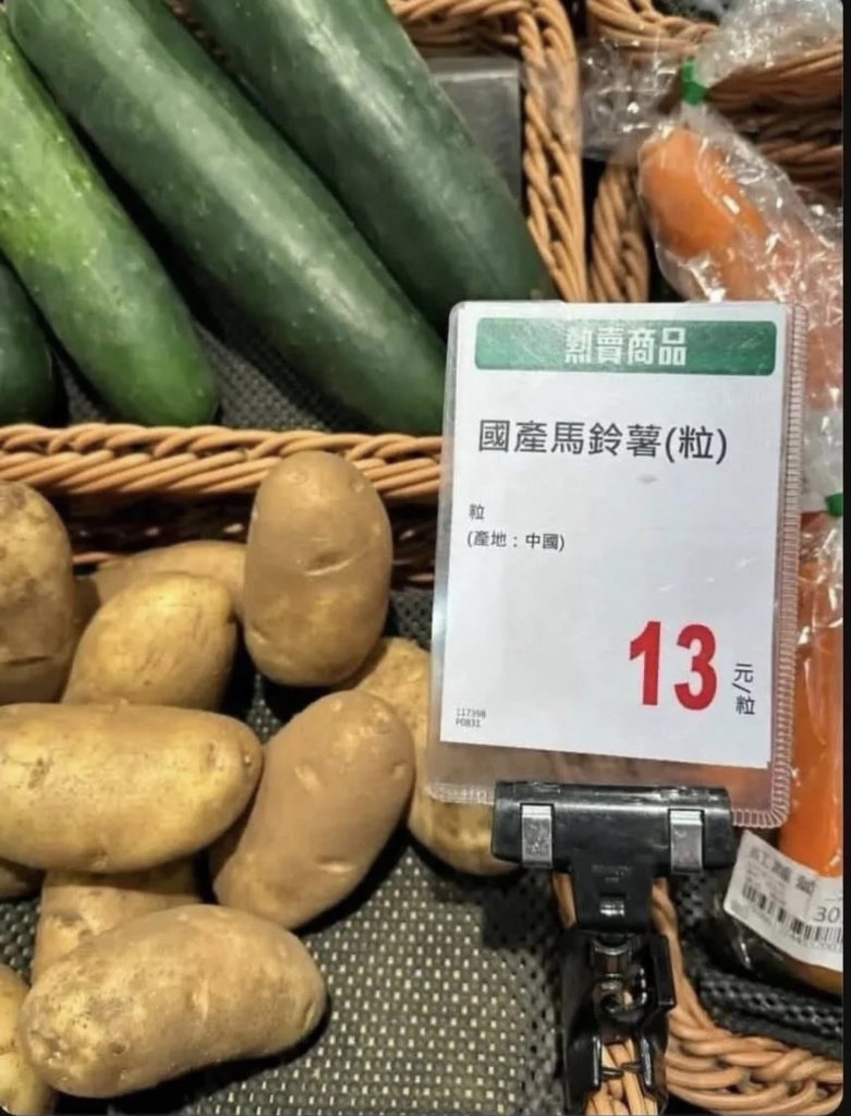Un panneau pour des pommes de terre indique : “pommes de terre locales”, mais l’origine mentionnée est la Chine 😂