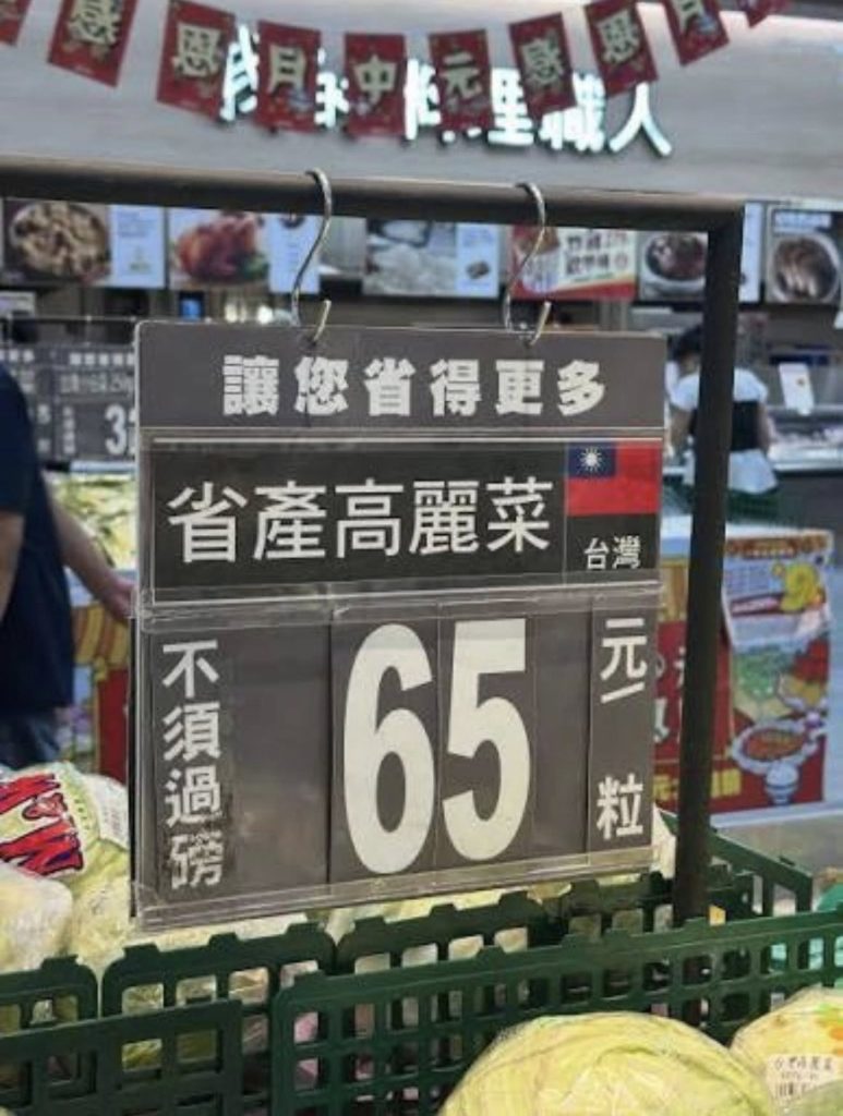 Un panneau pour du chou indique : “chou provincial”, mais l’origine mentionnée est Taïwan 😂