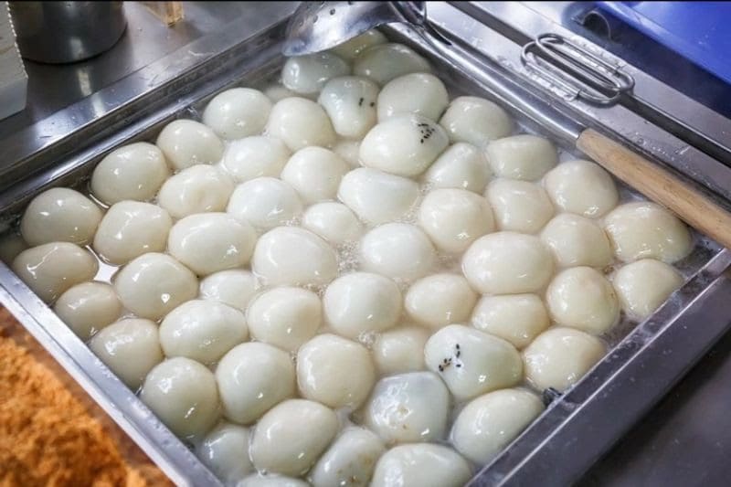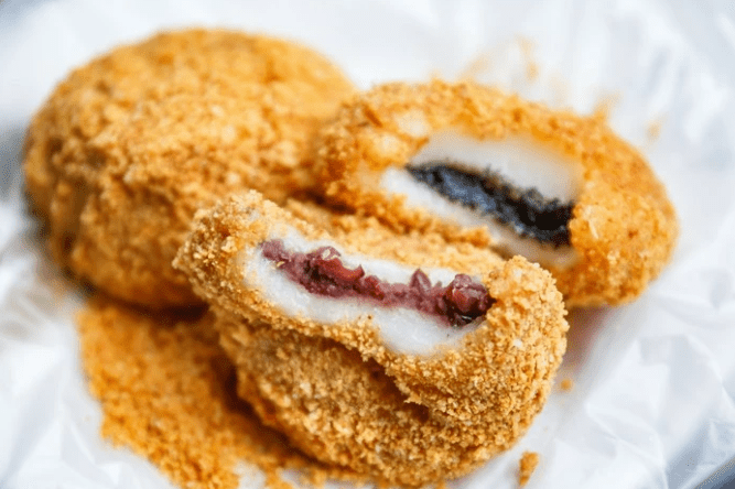 Ces boules de mochi géantes sont cuites dans de l’eau sucrée (sucre blanc ou sucre brun), et recouvertes de cacahuètes ou de sésame.