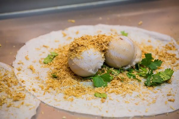 Spécialité du comté de 宜蘭 Yi-Lan, il s’agit de deux ou trois boules de crème glacée sur une fine feuille de rouleau de printemps, saupoudrées de poudre d’arachide, de sucre et de feuilles de coriandre, puis roulées dans un rouleau de printemps lol. Oui ! Vous avez bien entendu ! Cela peut paraître très étrange, mais je vous promets que c’est TELLEMENT BON ! Vous serez surpris !