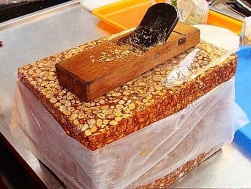 Vous pouvez voir un gros bloc de sucre de cacahuète ; le chef utilise un outil spécial pour râper les briques de sucre et les réduire en poudre. C’est l’un de mes desserts taïwanais préférés.