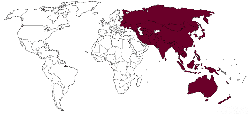- Asie (28 pays) : Afghanistan, Bangladesh, Birmanie, Brunei, Cambodge, Chine, Corée du Sud, Inde, Indonésie, Iran, Japon, Kazakhstan, Kirghizistan, Laos, Malaisie, Maldives, Mongolie, Népal, Ouzbékistan, Pakistan, Philippines, Singapour, Sri Lanka, Tadjikistan, Taïwan, Thaïlande, Timor oriental, Turkménistan, Viêt Nam.