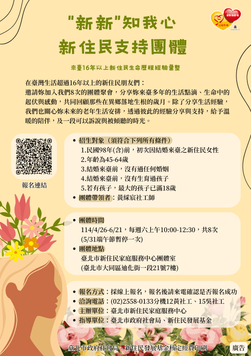 Les nouveaux immigrants résidant à Taïwan de plus de 16 ans sont chaleureusement invités à rejoindre ce groupe. Pour participer, il est recommandé de s’inscrire à l’avance via le lien suivant :
