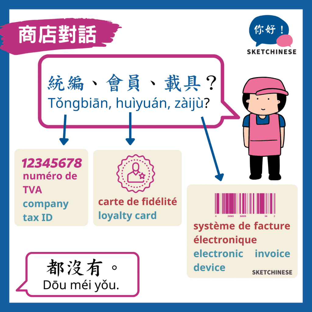 Notre voyage n’est pas encore fini. Très souvent, l’employé vous demande si vous voulez utiliser un numéro de TVA (統編, tǒng biān) et le système de facture électronique (載具, zàijù), et si vous avez une carte de fidélité (會員, huìyuán).