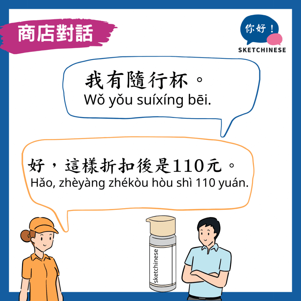 Dernière chose à ajouter : à Taïwan, vous recevrez une reduction (折扣, zhékòu) de 5 à 10 NT si vous apportez votre propre bouteille. Vous pouvez la montrer avant de payer en disant  « 我有隨行杯 » (Wǒ yǒu suí xíng bēi).