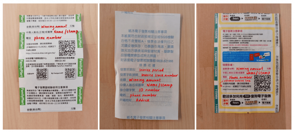 Pour les gains de 1000 NT$ ou moins, vous pouvez apporter votre ticket dans un convenience store pour votre réclamer votre gain entre 9h et 23h (7-11, Family Mart, OK Mart, Hi-Life, Simple Mart, Px Mart). Vous pouvez demander des espèces, un crédit en magasin, ou l’échanger contre quelque chose de valeur équivalente. Sachez que vous pouvez également récupérer vos gains à Carrefour.