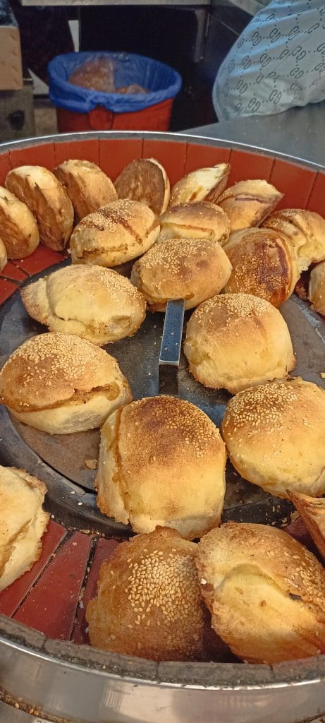 La véritable magie opère lorsqu’ils prennent chaque boule de pâte farcie et la plaquent habilement contre la paroi intérieure verticale du four. C’est un spectacle qui fait retenir son souffle, chaque pain reposant contre la paroi brûlante du four, dorant sous l’effet de la chaleur intense. L’agilité et la précision avec lesquelles chaque Pepper Cake est manié témoignent du respect et de l’admiration que ces artisans portent à leur métier.