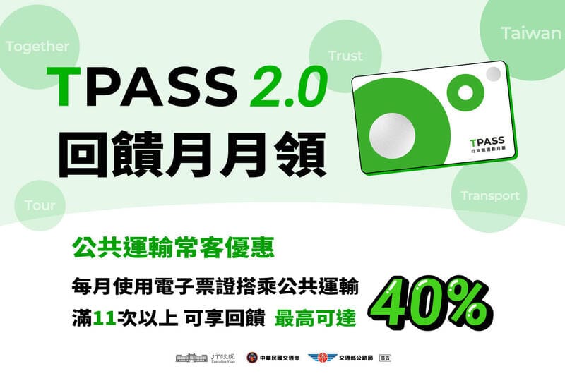 Le Ministère des Transports et des Communications (交通部) a lancé le TPASS 2.0 (台灣通行卡) pour stimuler l’usage des bus, des trains et des métros à Taïwan (Taïwan). Le programme propose des réductions importantes aux usagers réguliers afin de rendre les déplacements plus abordables.