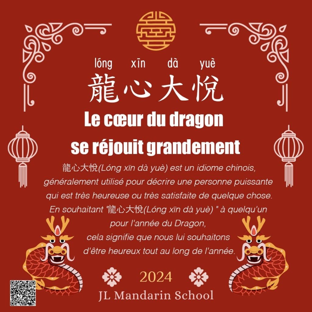 En souhaitant « 龍心大悅 (Lóng xīn dà yuè) » à quelqu’un pour l’année du Dragon, cela signifie que nous lui souhaitons d’être heureux tout au long de l’année.