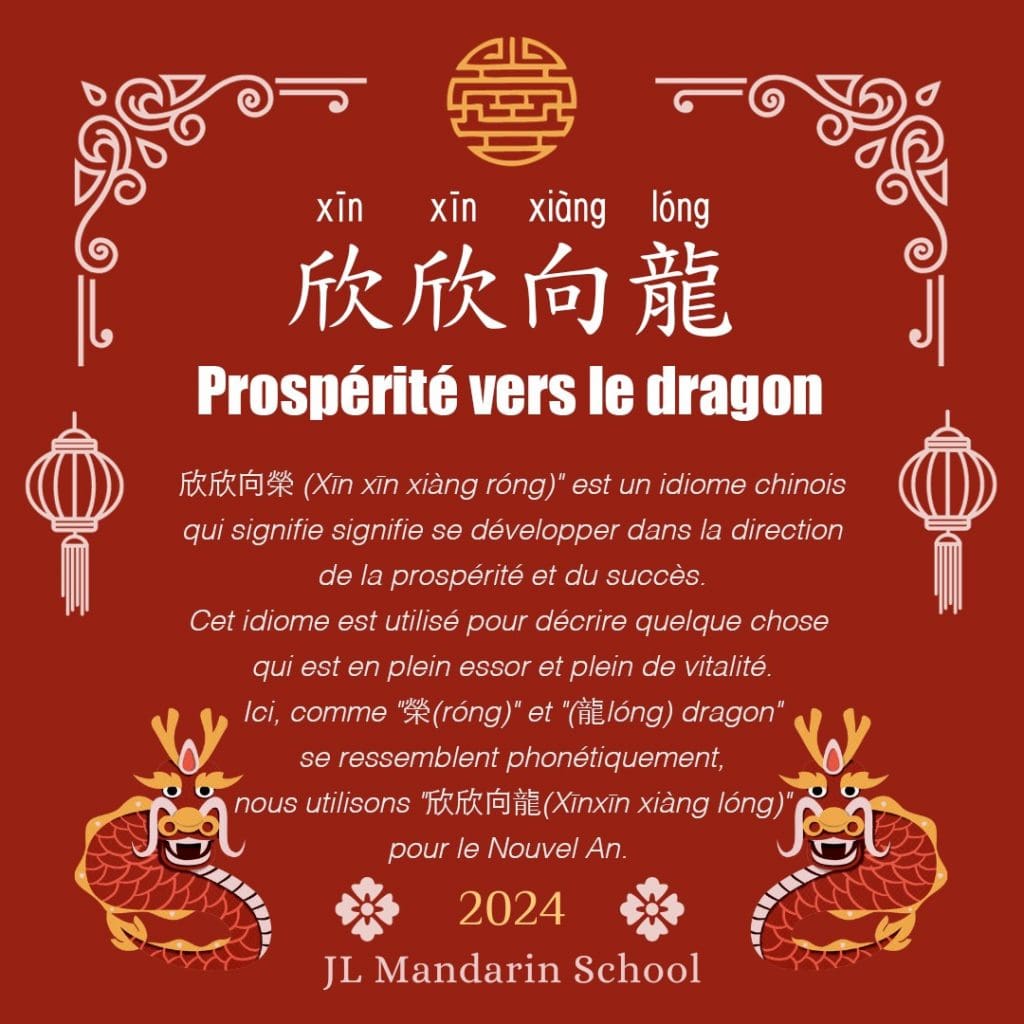 « 欣欣向榮 (Xīn xīn xiàng róng) » est une expression idiomatique chinoise qui signifie littéralement « fleurissant et croissant vigoureusement ». « 欣欣 (xīn xīn) » fait référence à quelque chose de plein de vitalité ou prospérant, et « 向榮 (xiàng róng) » signifie se développer dans la direction de la prospérité et du succès. Cet idiome est utilisé pour décrire quelque chose qui est en plein essor et plein de vitalité. Ici, comme « 榮 (róng) » et « 龍 (lóng) dragon » se ressemblent phonétiquement, nous utilisons « 欣欣向龍 (Xīnxīn xiàng lóng) » pour le Nouvel An.