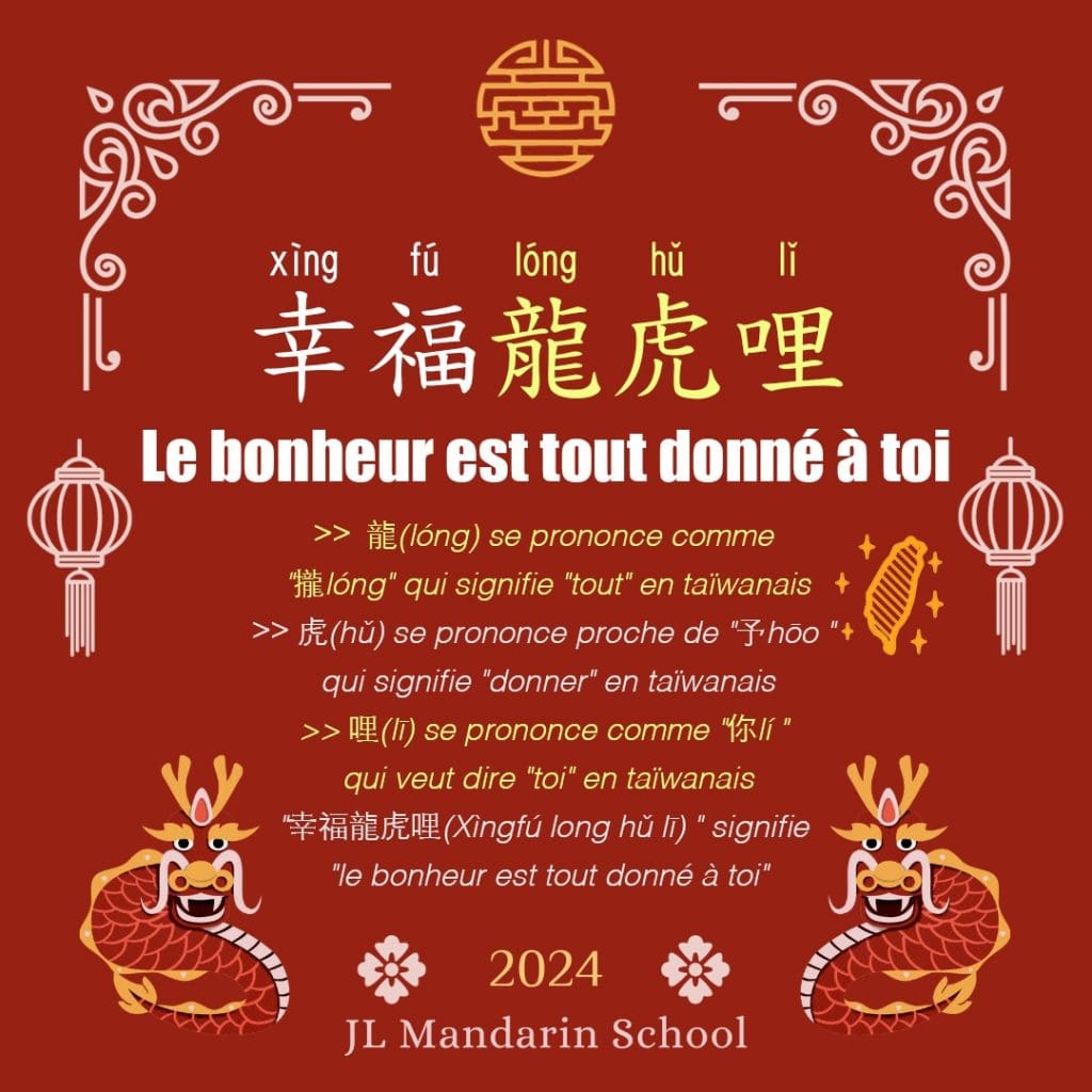 Je vous souhaite à tous 龍年快樂 (Lóng nián kuàilè) un joyeux Nouvel An du Dragon, 幸福龍虎哩 (Xìngfú lónghǔ lī) bonheur à toi comme le dragon et le tigre.