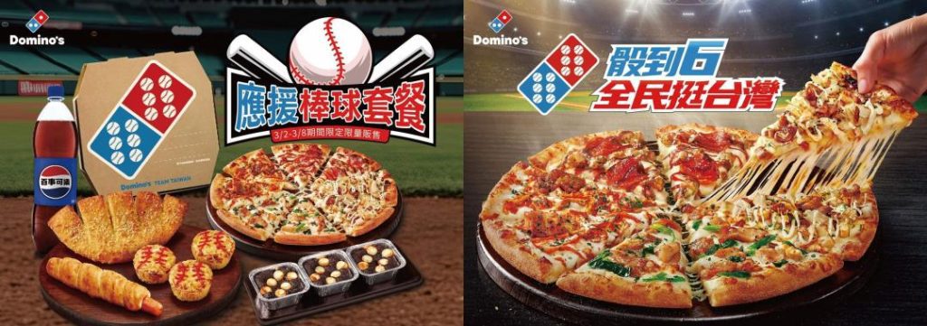 Un menu baseball “應援棒球套餐” (Menu spécial supporters baseball) est commercialisé du 2 au 8 mars à 799 NTD (~21,66 €). Il comprend la pizza spéciale, des pains aromatisés et une bouteille de soda 1,25L. Une offre “une grande pizza achetée, une offerte + soda” est également disponible via code promotionnel.