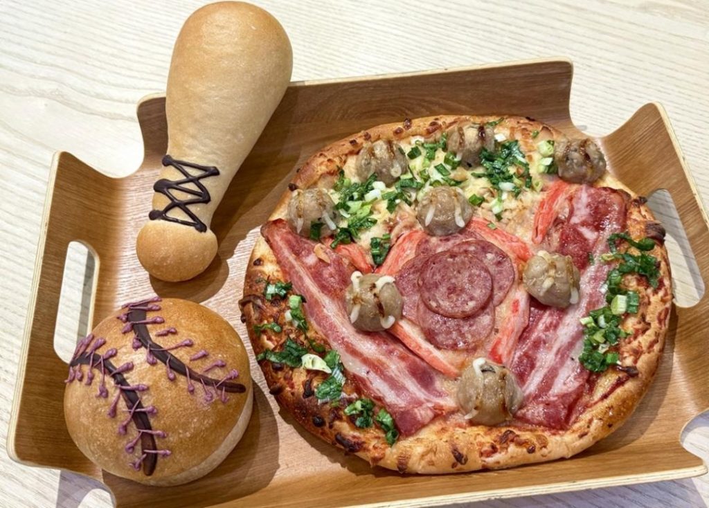 Carrefour Taïwan déploie son opération “台灣好棒” (“Taïwan, frappe fort”) à partir du 1er mars avec trois produits de boulangerie en forme de balle et de batte dans quatre magasins Nakery. La pizza “滿貫砲披薩” (Pizza Grand Chelem) est vendue 299 NTD (~8,10 €).