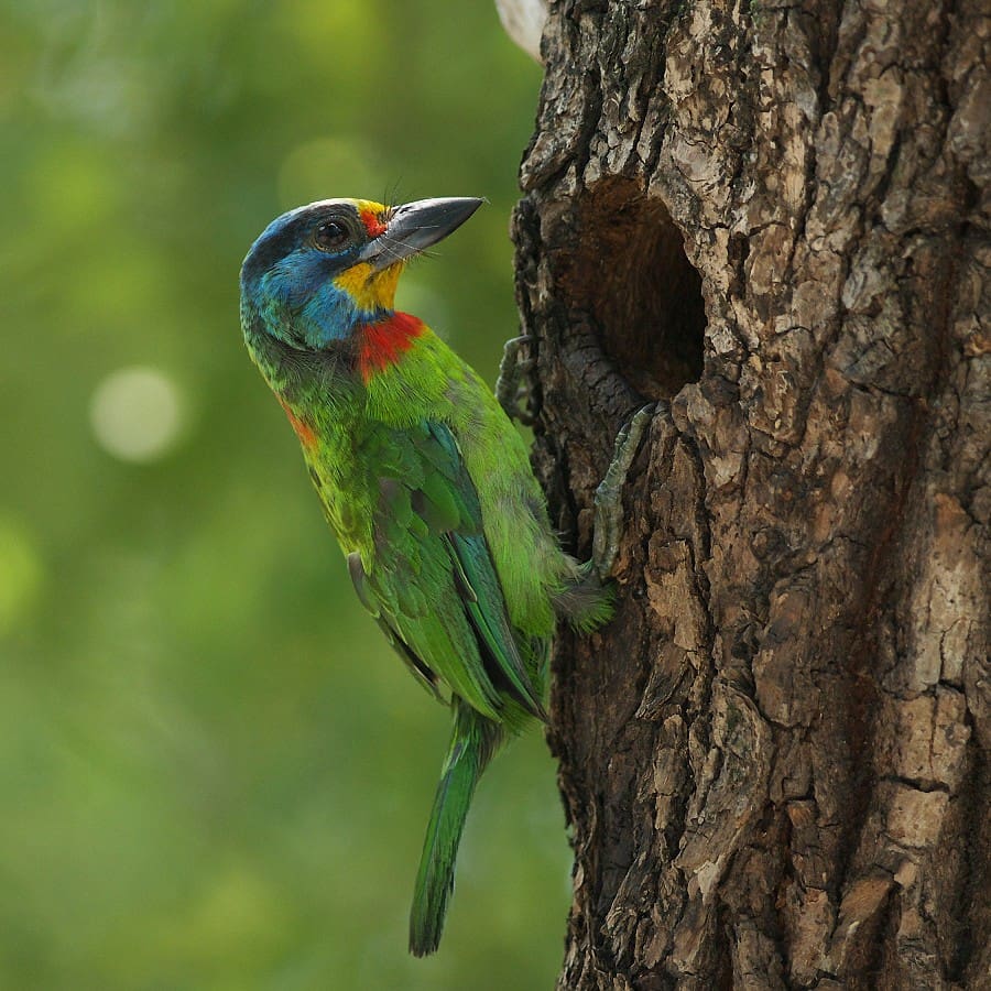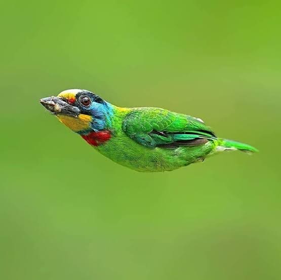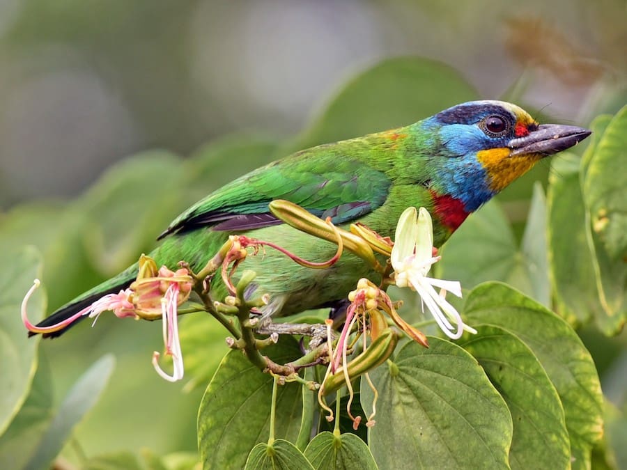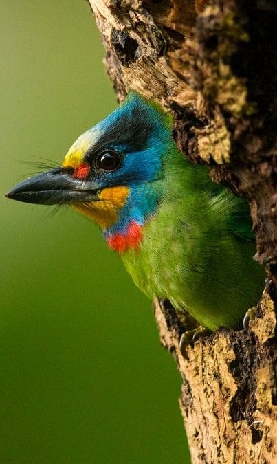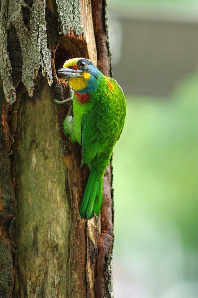 Long de 20 à 22 centimètres, le barbu de Taïwan se distingue par un plumage vert dominant, orné de touches rouges à l’arrière du cou, de bleu sur la tête, de jaune sur le menton et le front, et de noir autour des yeux. Ce coloris spectaculaire est à l’origine de son nom. Taïwanais jusqu’au bout des plumes, il vit principalement dans les forêts de moyenne altitude (jusqu’à 2 400 mètres), mais il s’adapte aussi très bien aux milieux urbains comme les parcs et les campus.